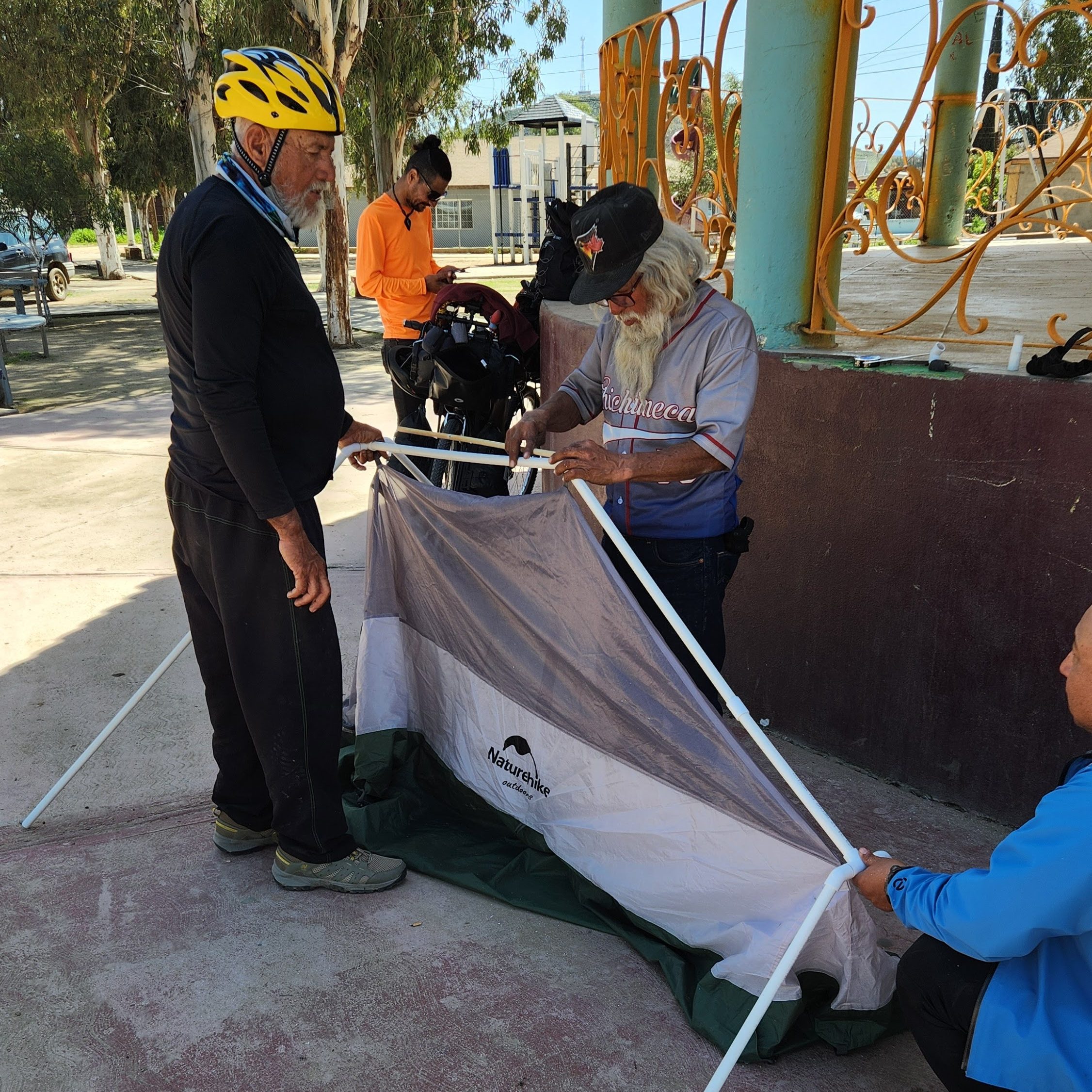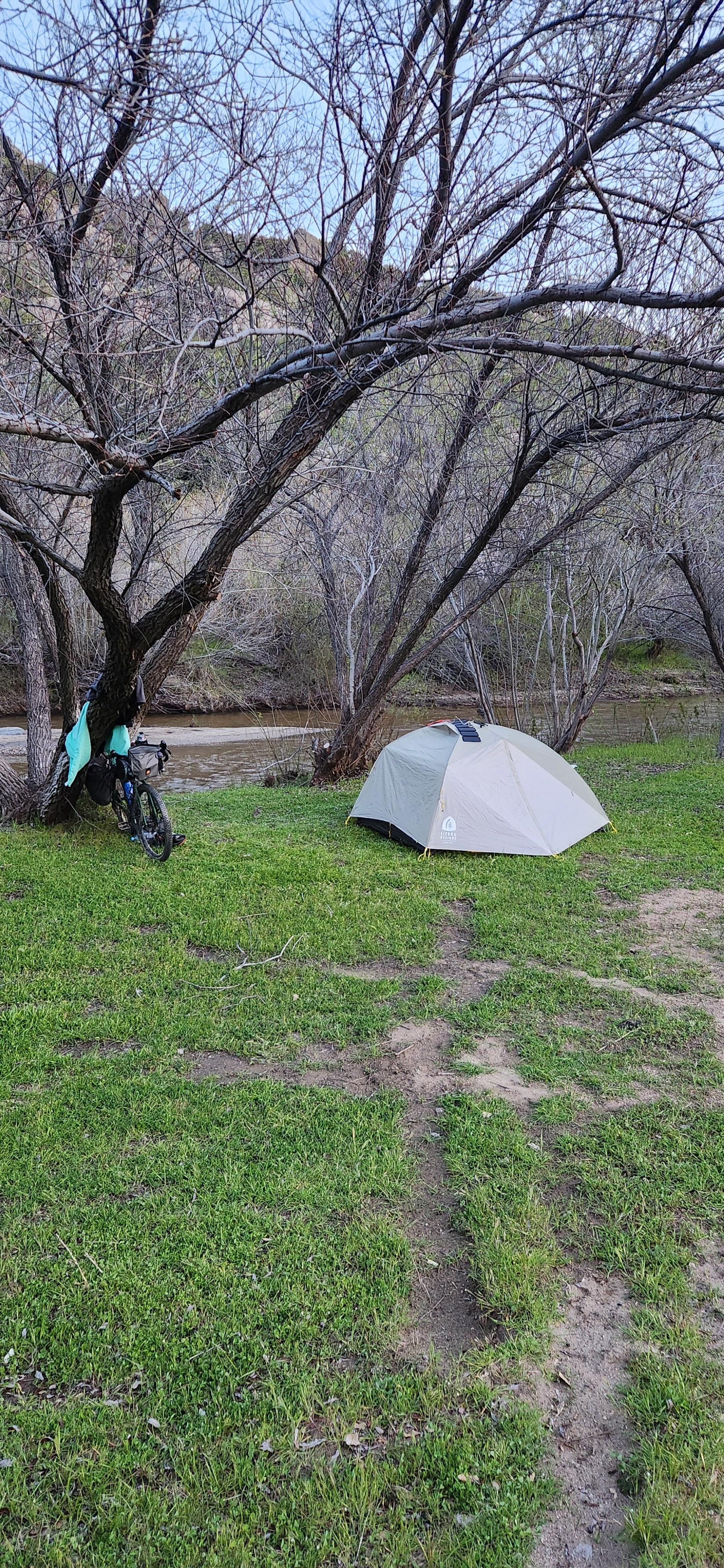 Beautiful camping spot along the river. A cold dip in the water for a bit of a clean. Helping Jose fix his tent in the square of Ojos Negro.