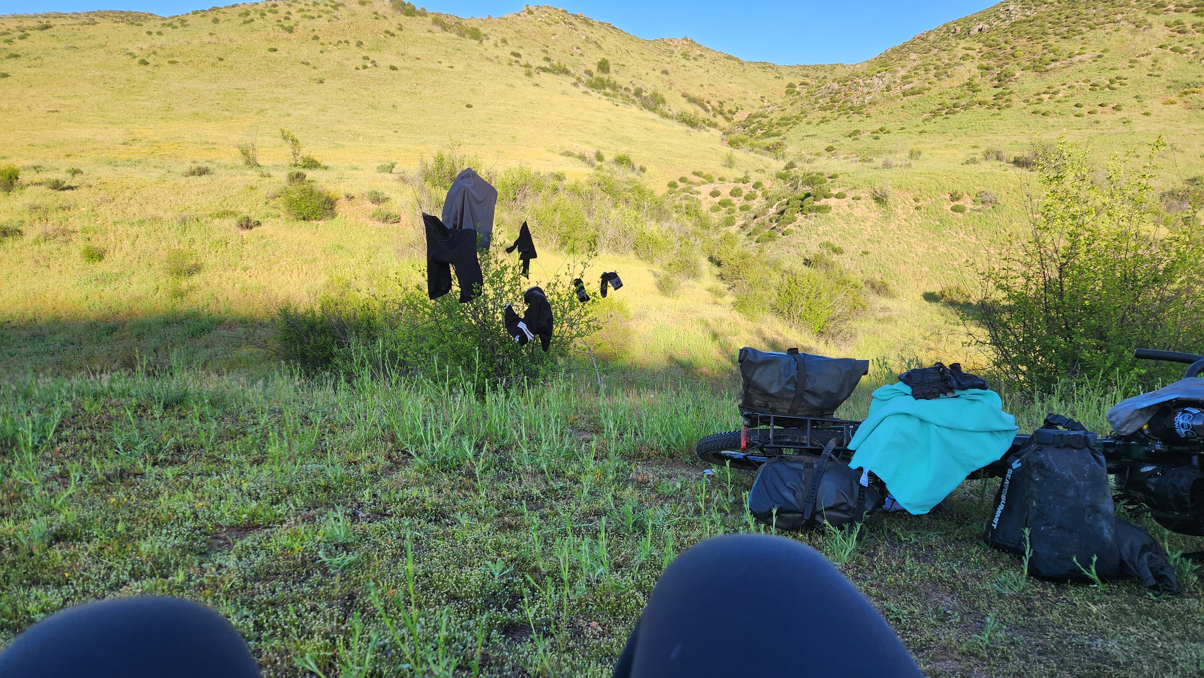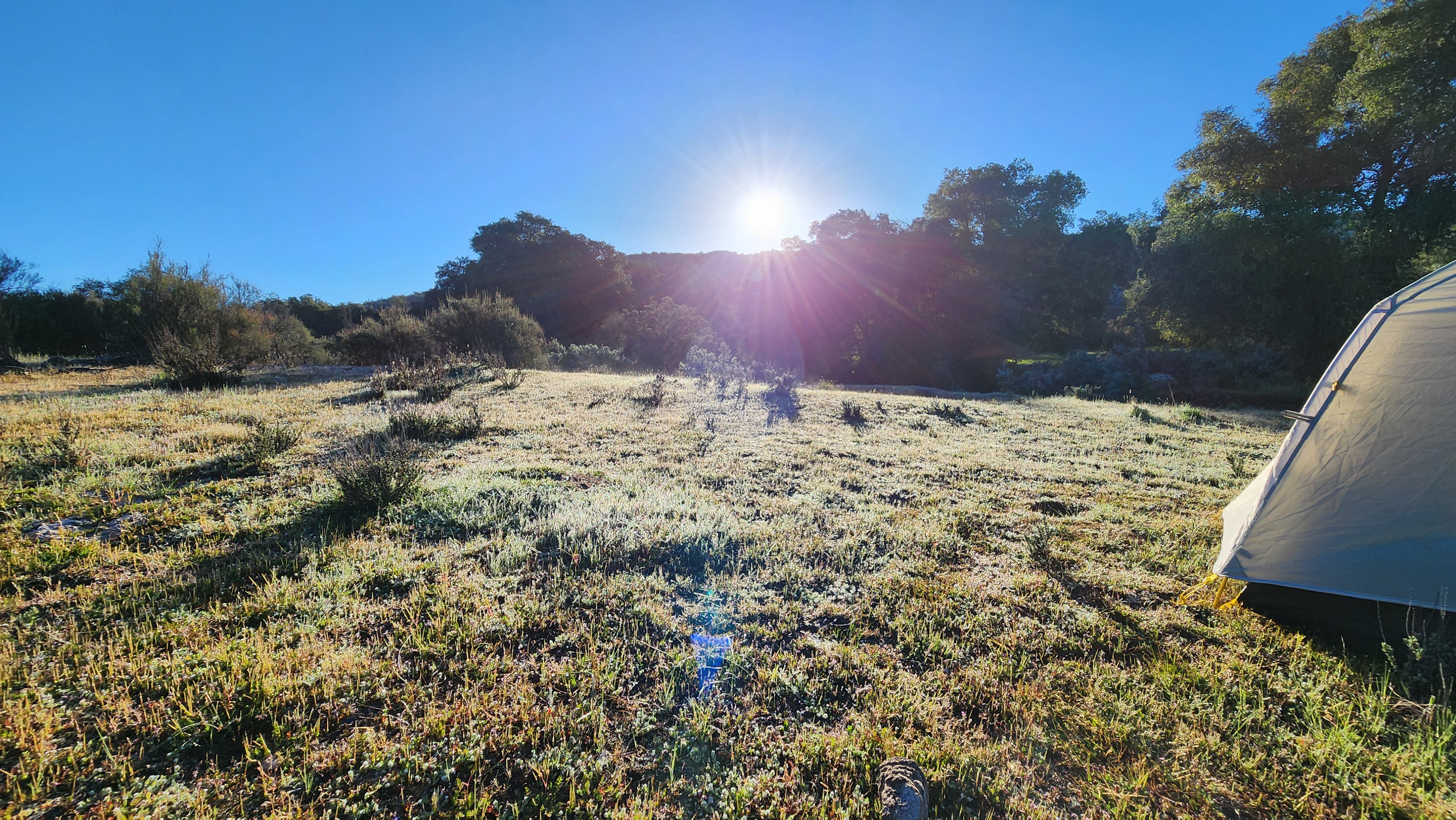My first wild camping experience. This was an evening of so many firsts. Glad I was so tired as I fell asleep pretty quickly except for when I needed the toilet. When I woke up everything was covered in frost and had to melt the ice in my water bottles.