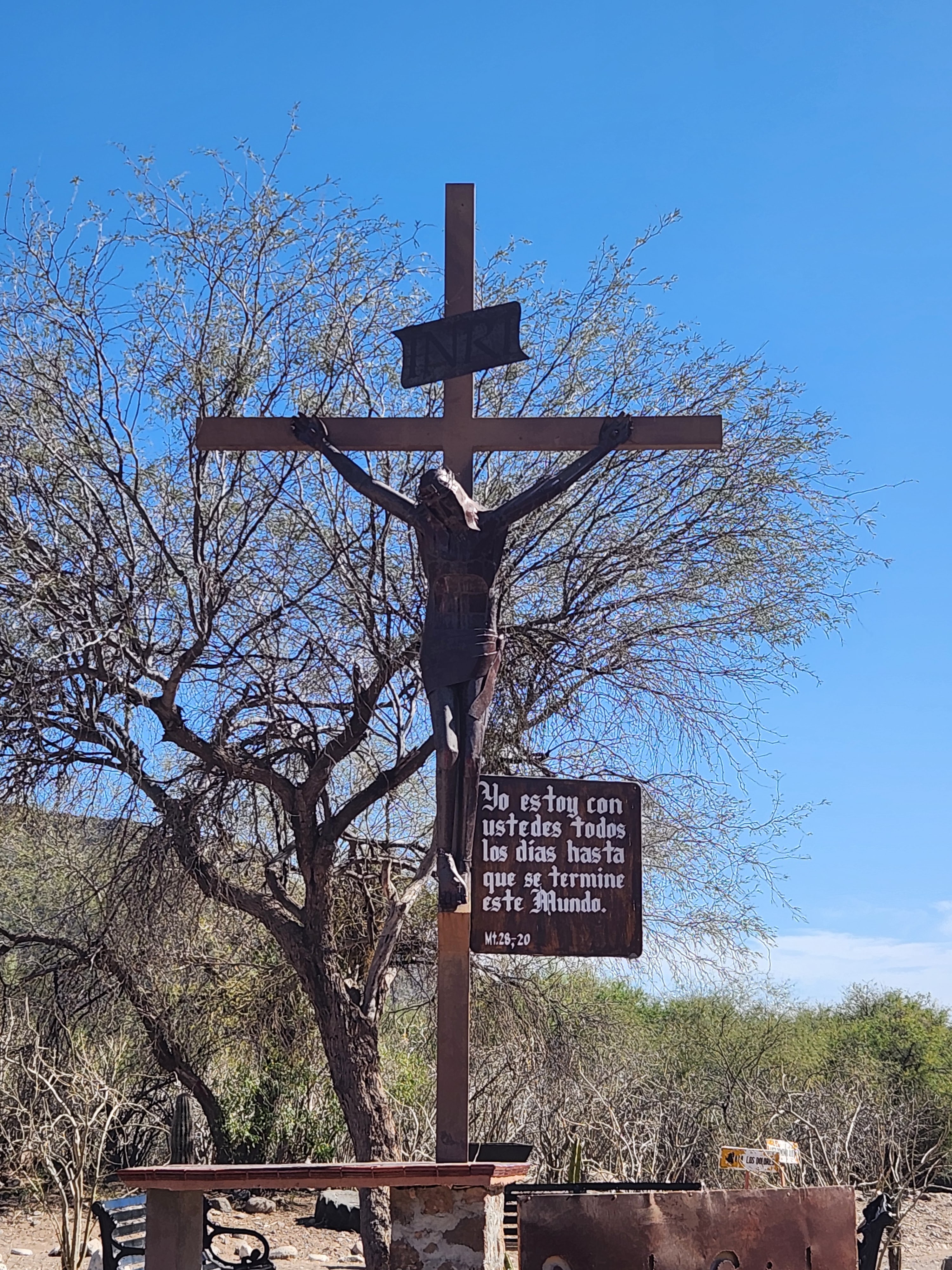 A random crucifix in the middle of the desert. The catholic faith is strong in Mexico. Looking back towards Rancho Santo Domingo