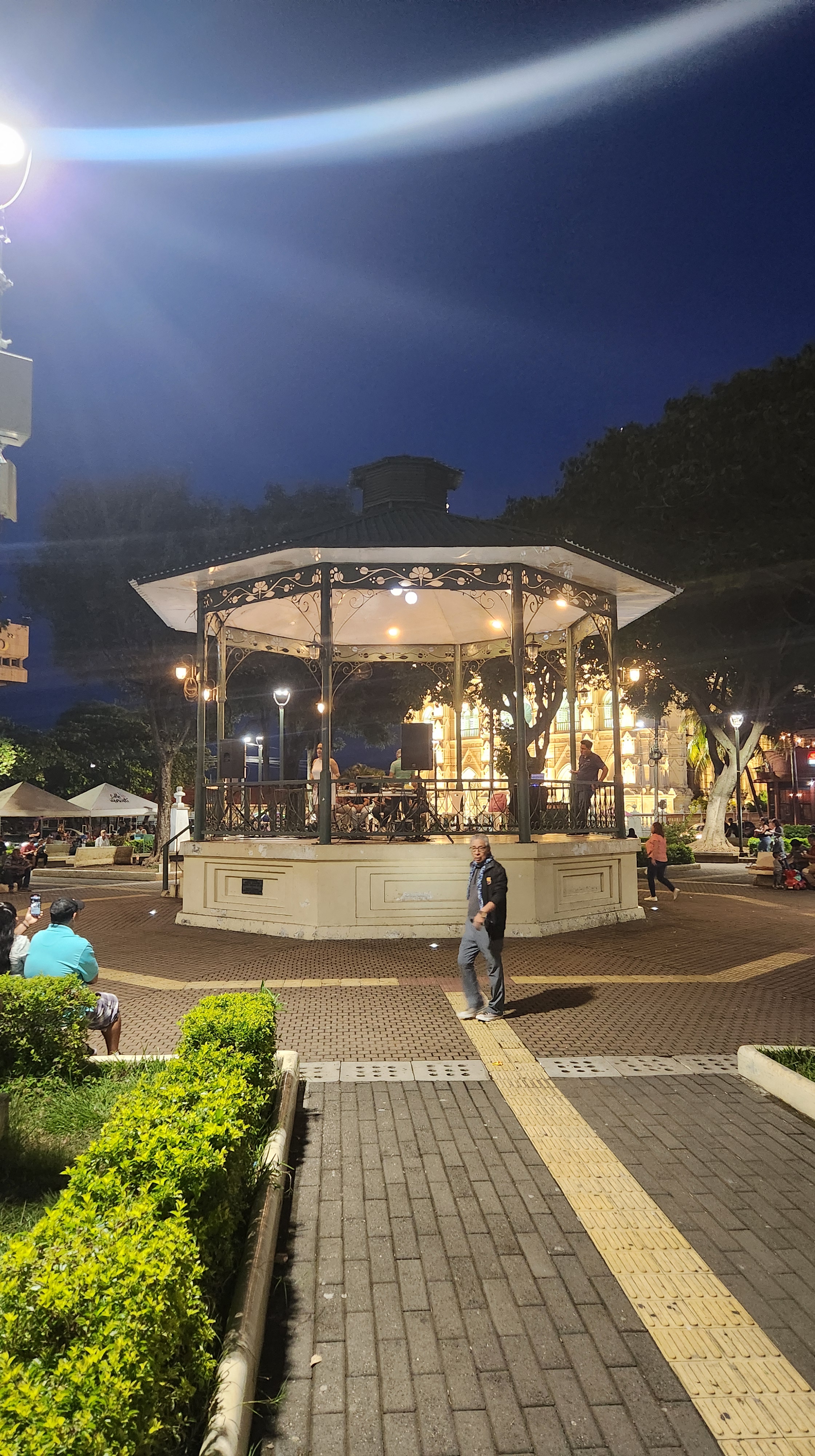 The long wait for food from the back of a car for those in need. The live music being played in the plaza.