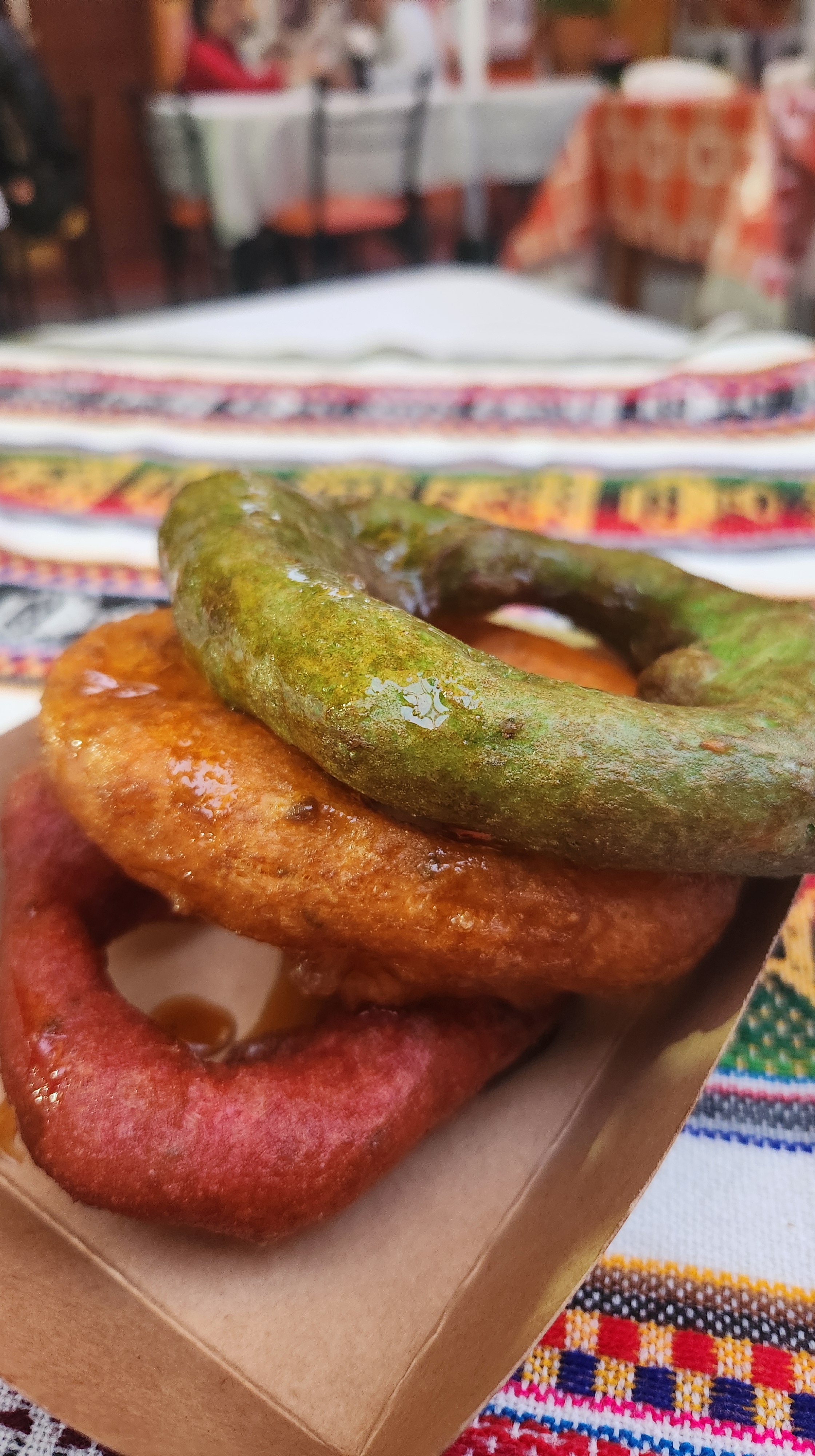The church in tiny Characato facing the plaza where I would watch the sunset. Delicious three types of Picarones.