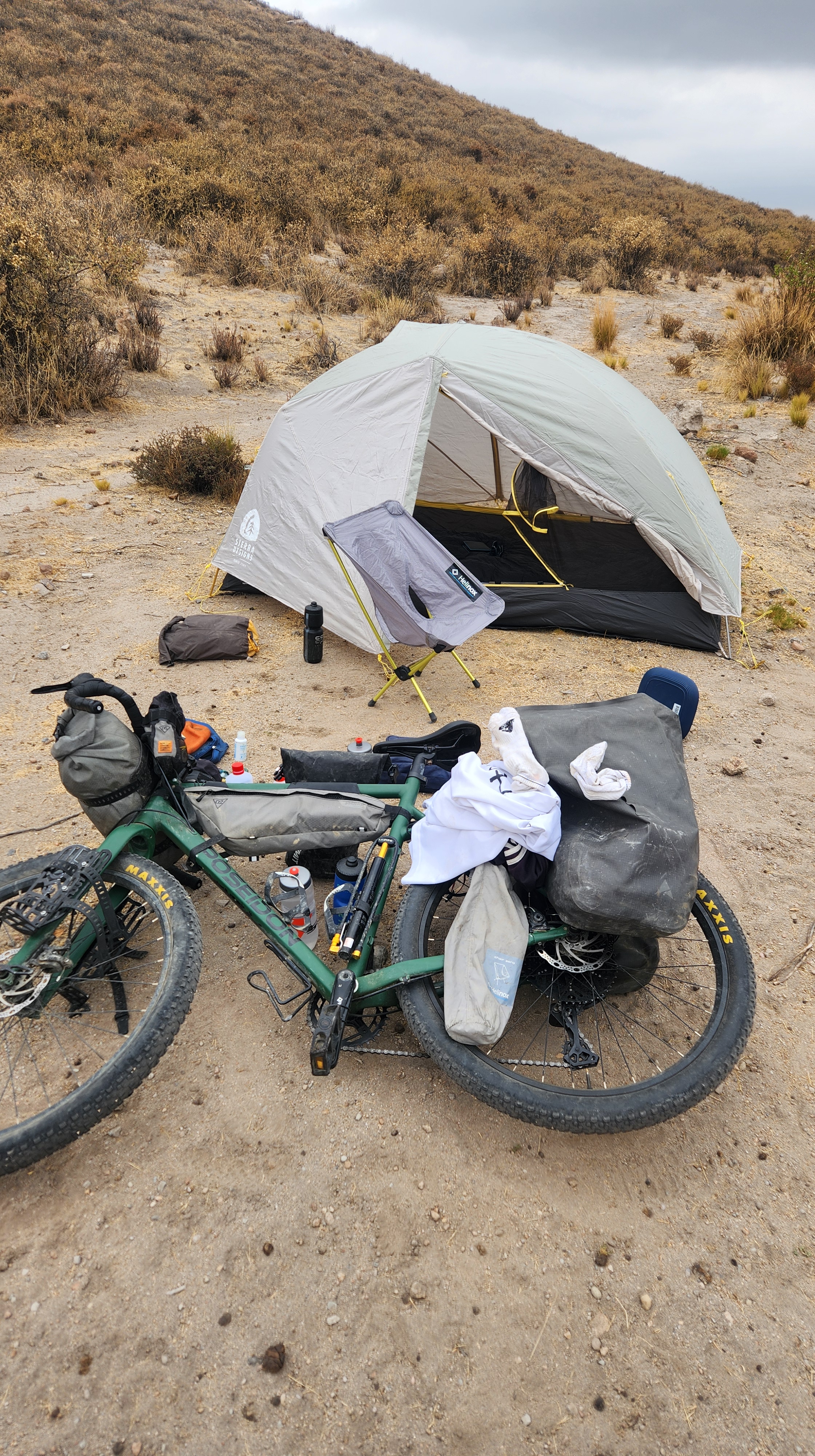 About five kilometers farther on, I found a small wild campsite listed on iOverlander. It sat beside a drainage stream about 150 meters from the road. The view of Misti was stunning, and I also saw my first alpaca. I set up camp and, for the next hour or so, felt content—happy to be back in the rhythm of camping.